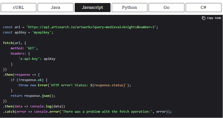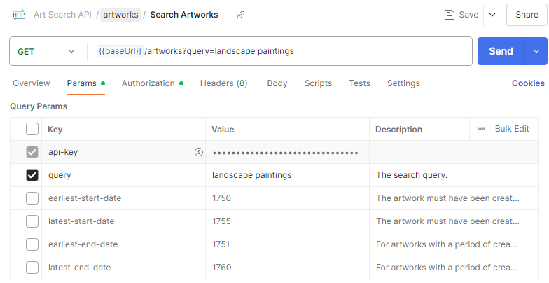 Postman Collections are a great way to get started with an API if you want to play around with its capabilities. Art Search has a public Postman collection.